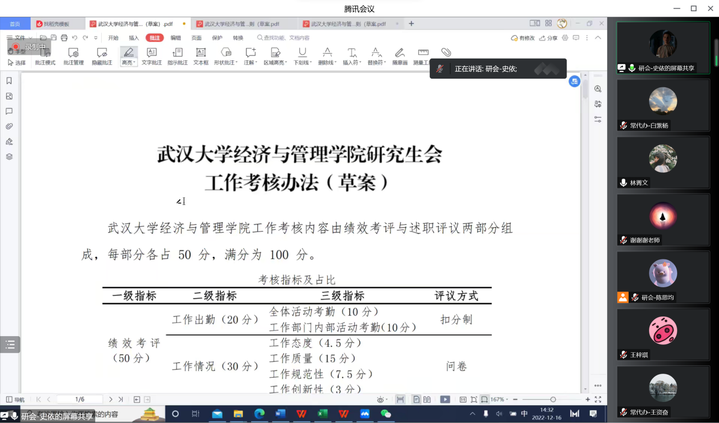 最后,会议听取并审议了《武汉大学经济与管理学院研究生会工作考核办法(草案)》《武汉大学经济与管理学院研究生会工作情况考评实施细则(草案)》《武汉大学经济与管理学院研究生会述职评议实施细则(草案)》。《武汉大学经济与管理学院研究生会工作考核办法(草案)》规定武汉大学经济与管理学院工作考核内容由绩效考评与述职评议两部分组成,分别围绕工作出勤、工作情况和思想作风、述职报告展开。《武汉大学经济与管理学院研究生会工作情况考评实施细则(草案)》从工作态度、工作质量、工作规范性、工作创新型四个维度对工作情况进行评议。《武汉大学经济与管理学院研究生会述职评议实施细则(草案)》规定从职能感悟、工作现状、工作反思、下学期工作规划四个维度对主席团成员、部门负责人以及部门工作人员进行评议,并将对院研究生会的建议设为加分项。