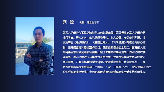 主持人:接下来是龚锋教授做报告。龚锋老师是武汉大学经济与管理学院财政与税收系教授,美国德州农工大学经济系访问学者。研究方向是公共服务均等化、收入分配、老龄公共政策。在《经济研究》《管理世界》《科学通报》等权威与核心期刊发表多篇论文;主持国家社科基金重点项目、国家自科基金面上项目、教育部人文社科基金规划项目等多项课题。担任中国财政学会理事、湖北省财政学会理事、湖北省财政厅预算绩效评审专家、中国税务学会中青年税收研究会理事。获教育部高等学校科学研究优秀成果奖(青年成果奖)、湖北省社会科学优秀成果奖(二等奖1次、三等奖2次)、武汉大学经济与管理学院人文社科优秀成果奖特等奖、全国财政理论研究优秀成果奖一等奖等科研奖项。他今天跟我们分享的题目是《促进共同富裕目标的收入分配与再分配制度改革:二十大提出的新方向》,下面有请龚锋教授。